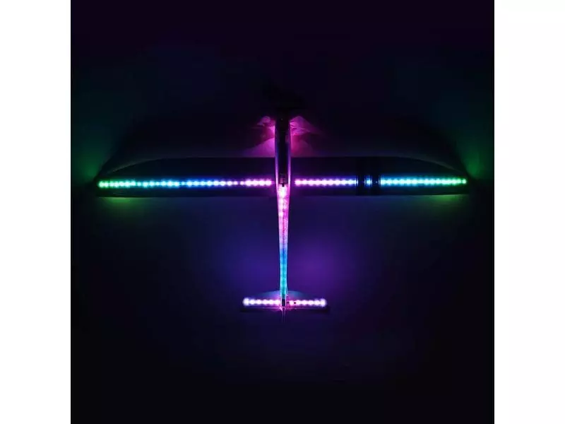 Im gesamten Modell ist eine werkseitig installierte LED-Beleuchtung fertig verbaut. Diese bietet beim Fliegen in der Nacht eine unglaubliche Sichtbarkeit und einfache Orientierung. Die mehrfarbigen LED-Streifen sind mit einem integrierten Controller verbunden, der mehr als 100 verschiedene Farb-, Sequenz- und Timing-Kombinationen bietet und praktischerweise vom 3S 1300-2200 mAh Flug-Akku betrieben wird. Mit dem on-board Schalter können Sie die Beleuchtung für Flüge bei Tag jederzeit ausschalten.