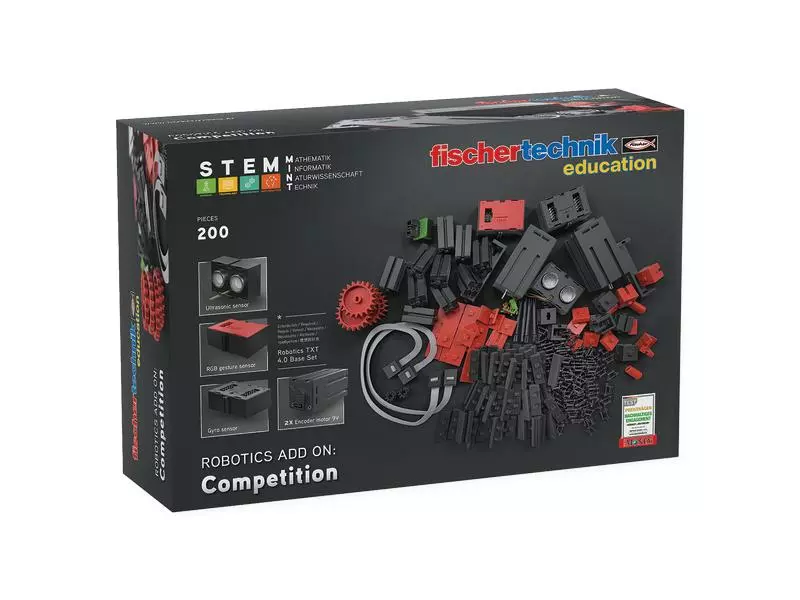 Das fischertechnik Robotics Add On: Competition wurde für Schulen, Universitäten und sonstige Bildungseinrichtungen entwickelt, die ihre Modelle für Robotik-Wettbewerbe für ihre Schüler und Studenten weiterentwickeln oder verbessern möchten. Mit diesem Set lassen sich Modelle tunen und um neue Features erweitern, was diesen Baukasten zur perfekten Basis für Wettbewerbe auf der ganzen Welt macht. Das Set enthält einen Gyrosensor (Gyroskop, Beschleunigungssensor und Kompass in einem Sensor), einen Ultraschallsensor, zwei starke Motoren sowie Kettenglieder und Rastraupenbeläge für das Fahrgestell eines Raupenroboters, die perfekte Basis für starke Roboter.